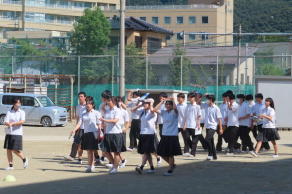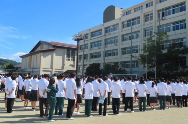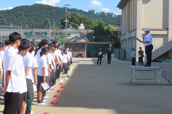 9月26日(金)防災避難訓練が行われました。教頭先生より、「落ち着いて安全に避難することを心がけてください。所定の経路で避難できない時は、自分の命を守るために一番良い方法を考えて、安全に避難してください。そういう力を高校生活を通して身に着けてもらいたい」とありました。