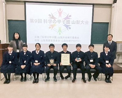 1年の後期から行う課題研究は、探究科の探究活動の中核をなすものです。人文・社会科学分野から自然科学分野まで、幅広い分野の中から各自で決めた研究テーマに沿って少人数のグループを組み、課題解決に向けて取り組むとともに、「英語によるプレゼンテーション能力」等を養成します。その成果は、2年次の海外研修旅行において英語で現地の高校生に発表する機会や、3月に行う『山梨ブランドサミット』と題した研究発表大会で実を結んでいきます。